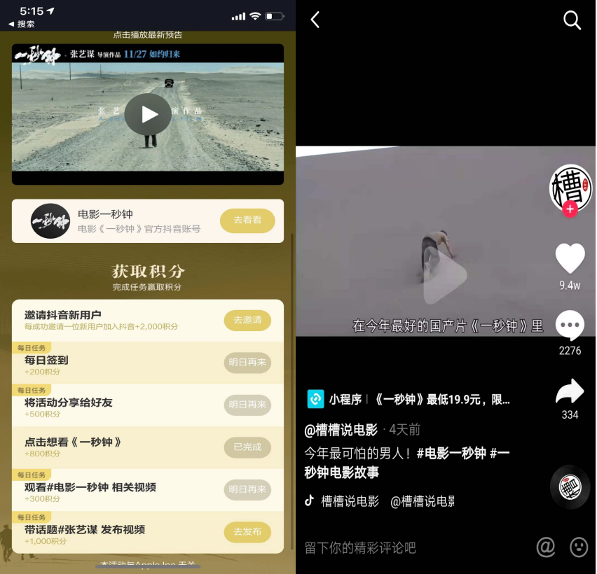 除此之外,猫眼与抖音双方合作打造了定制活动落地页,通过“完成任务-获取积分-换取电影票”的形式直接为短视频宣发的转化环节加分。在合作中,抖音开放了发现页、话题页、搜索结果页入口的优势资源,全方位助力电影宣发,提升宣发效率。