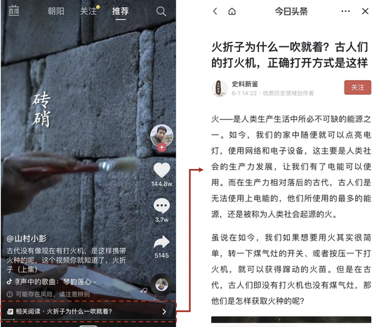 近日,抖音推出“相关阅读”功能。比如在一条关于“火折子”视频下方的关联文章,就详细讲解了火折子的起源、成分、对生产生活的作用,以及古人对火种的使用历程。